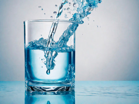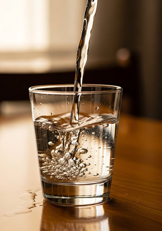 A stunning close-up of fresh water pouring into a glass, creating bubbles as it flows and reflecting light on a calm surface, symbolizing freshness and hydration.