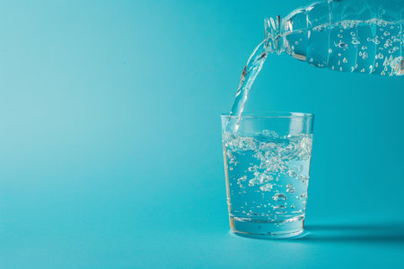 Refreshing hydration scene showcasing pure water cascading from a sleek bottle into a glass brimming with lively bubbles, set against a soothing blue backdrop.