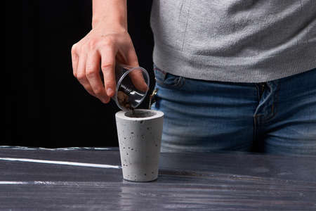 man pour soda drink from a bottle into highball glass on concrete countertop with copy space