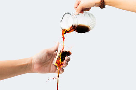 Pouring soda water from bottle into glass in sepia tone.Toned image,soft focus,film noir style.
