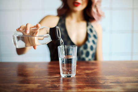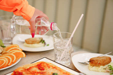 Crop slim female in stylish outfit pouring fresh water from transparent bottle into glass placed on wooden table