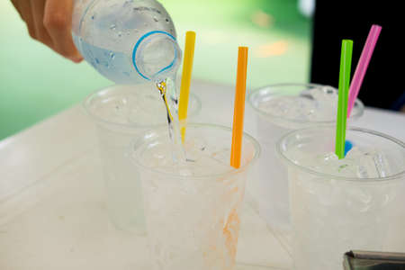 soft drink is poured into a glass of plastic,beverages for children and tourists,cold drinks to quench hot and thirsty at service point