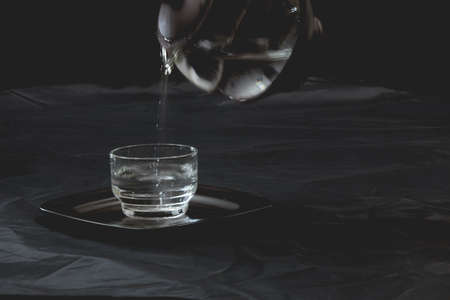 Water with bubbles in the glass.Pour water from a pitcher into a glass. Light passes through a glass.Creative abstract background for different purpose.Copy space Selective focus