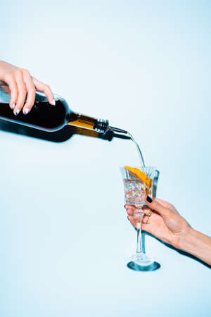 cropped view of woman holding bottle and pouring alcohol drink in glass with sliced orange on blue