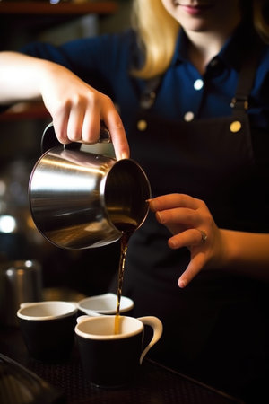 Hand holding coffee mug and pouring hot water coffee to coffee dripper on white background - Hand drip coffee show float and bubble water with copy space