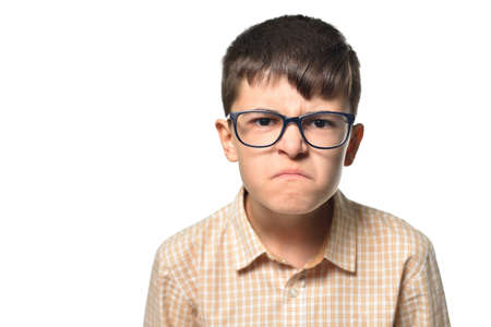 Portrait of a bad looking boy, sick and with discomfort in his body, isolated on white background.