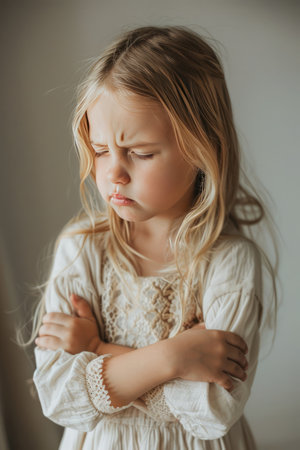 AI Generated. Expression of determination seen in a young child with intense eyes and an angry frown captured indoors during the late afternoon