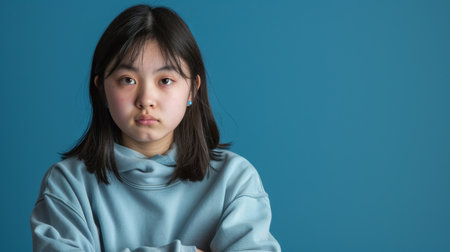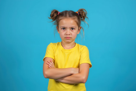 A young girl with her hair in pigtails, wearing a yellow t-shirt, and crossing her arms with a serious expression against a blue background.