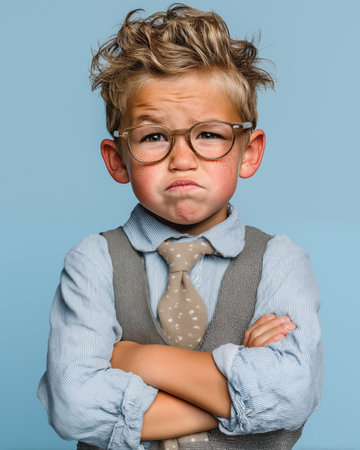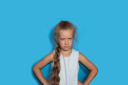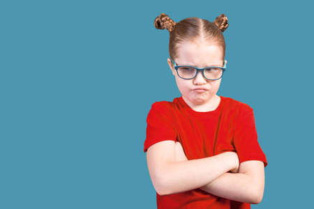 little girl with glasses offended. Isolated on a blue background. For any purpose.