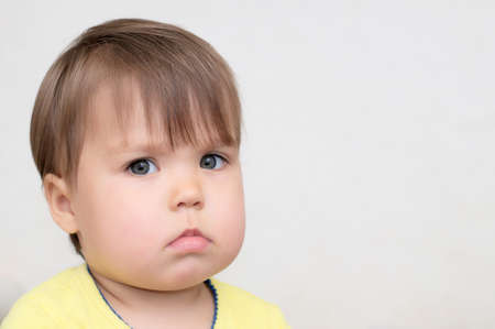 Little three year old girl looks angrily into the frame. Concept of a crisis of three years.