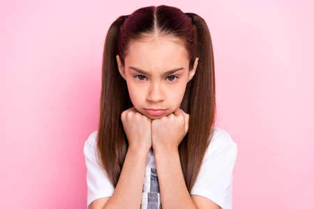 Photo portrait of little girl with tails sad unhappy grumpy got bad mood isolated on pastel pink color background