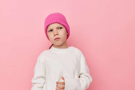 Portrait of a young upset blonde girl with curly blonde hair standing isolated over pink background