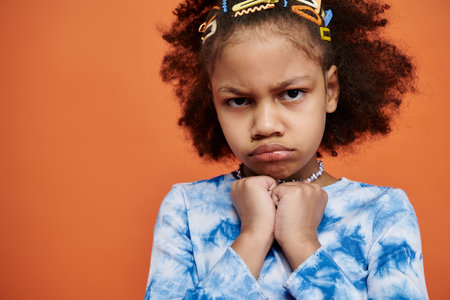 A young African American girl with curly hair stands against an orange background, wearing a trendy outfit and a serious expression.