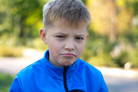 Portrait of sad schooler with blond hair on blurred background. Cute little boy looks aside standing against hotel territory at resort close view