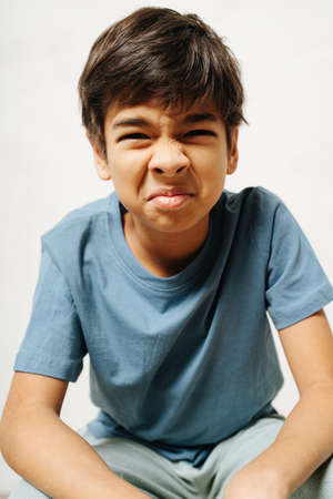 Grimacing indian boy sitting with wrinkled tense face over white background. He wears simple cotton shirt and pants. indoors.