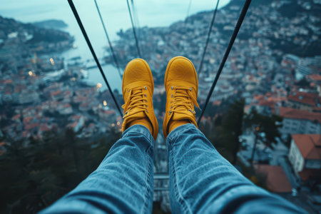 Person with yellow shoes hangs their feet from a cable car while enjoying stunning views of a coastal city with hills and water.