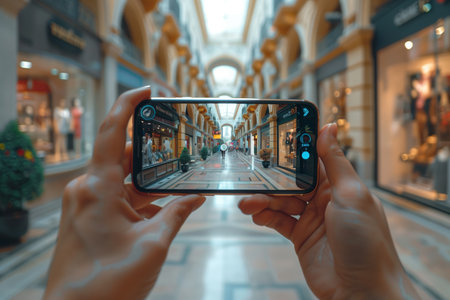 Hand holding smartphone displaying augmented reality app with shopping information inside a mall