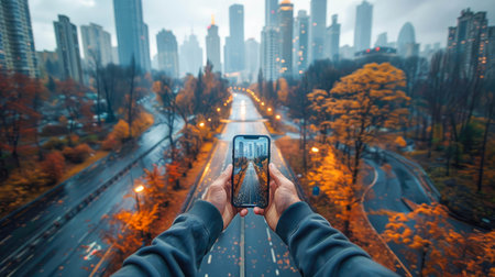 Hands holding a smartphone capturing a cityscape with autumn trees and a wet road.