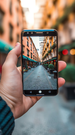 Capturing autumn beauty with a smartphone in a picturesque urban setting on a sunny day. Generative AI