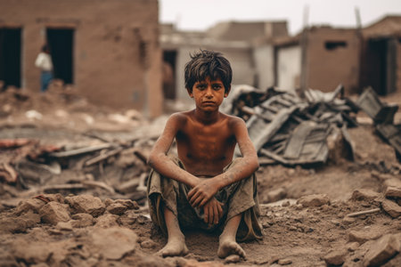 a young boy sits on the ground in front of a destroyed building