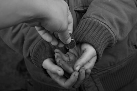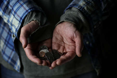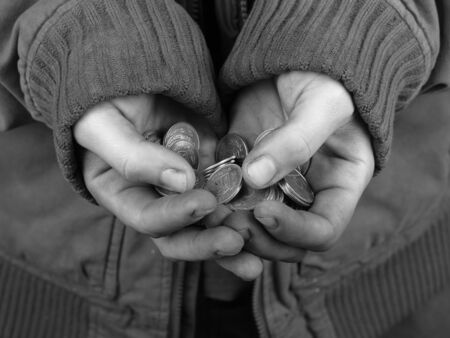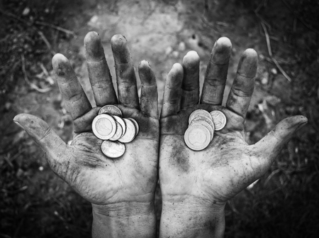 the poor man holds a handful of coins in black and white closeup