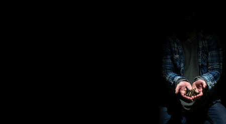 homeless begging hand of man with money with shadow edge in white tone