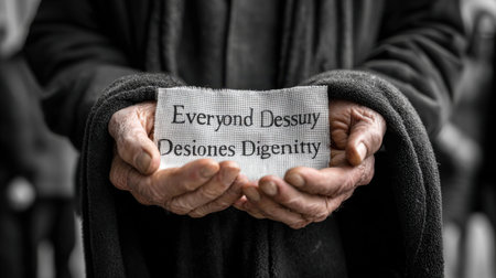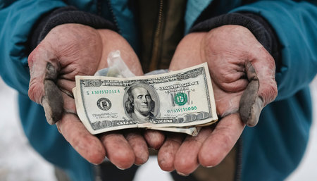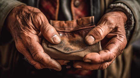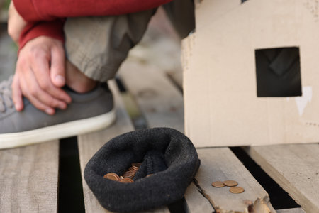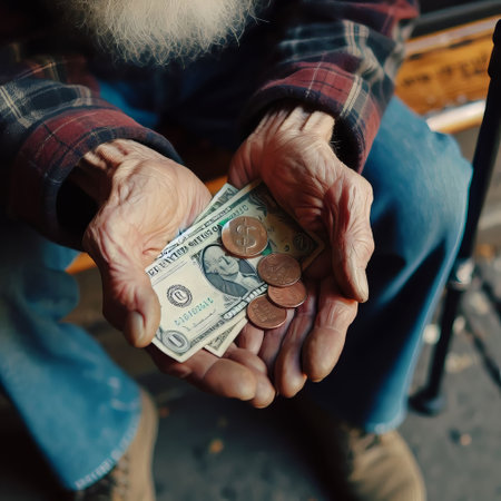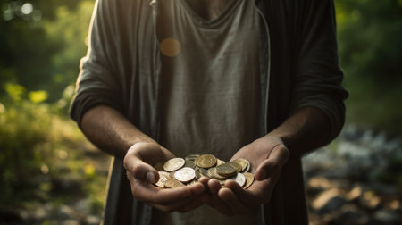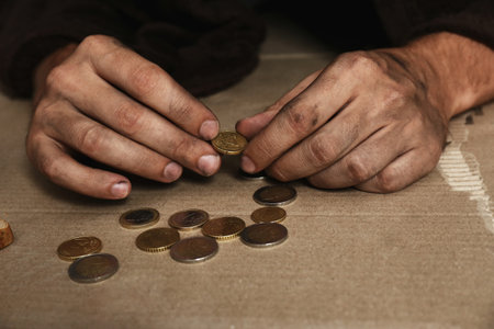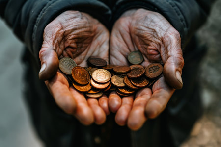 Closeup of a homeless man holding coins outdoors, evoking empathy and highlighting the harsh realities of poverty and social inequality. Ideal for charity campaigns and social advocacy.