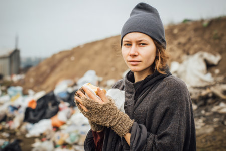 A young homeless woman holds bread in her hands against the background of a garbage dump. AI-generated item