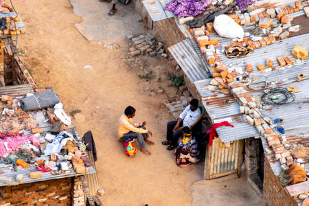 Delhi, India - circa 2020 : Aerial shot of people sitting wearing face masks outside their ramshakle temporary houses in a slum. The brick houses with a tin roof are unstable cramped structures with filth all around