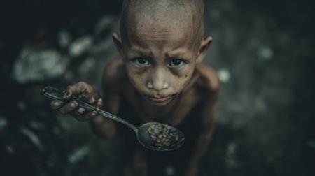 Starving boy gazes at the camera, holding a spoon, surrounded by a bleak, neglected environment.