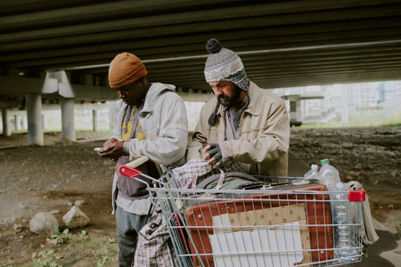 Middle aged Black man using smartphone while standing next to middle aged Caucasian man pushing shopping cart filled with belongings under urban overpass outdoors