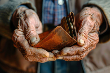 Empty wallet in the hands of an elderly man. Concept of retirement poverty. Generative AI
