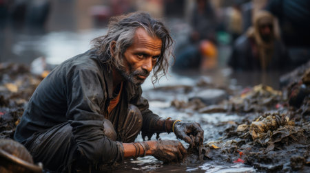 A profound scene depicting an Indian man with a concerned expression, kneeling in a heavily polluted river. His hands are engaged in gathering or sorting through the wet debris and waste.