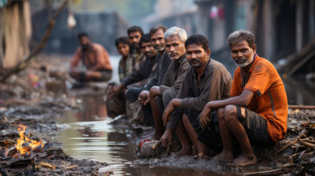 A compelling image of a group of Indian men gathered around a small, polluted river in a rural area, sharing moments and engaging in conversation.