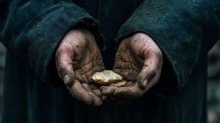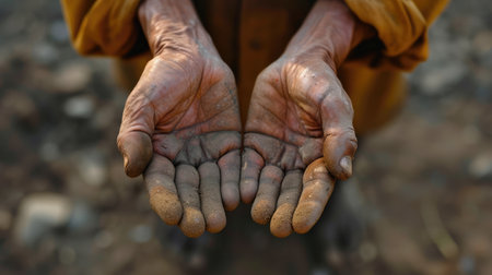 This close-up image portrays worn hands holding a cracked object, showcasing the beauty of texture and nature. The earthy tones and intricate details create a powerful story of age and authenticity.