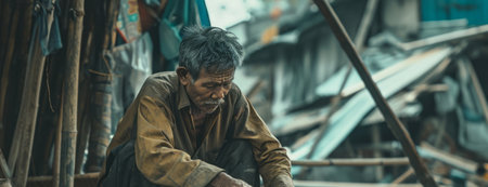 war immigrant man constructing a makeshift shelter using salvaged materials AI generated