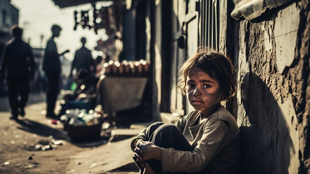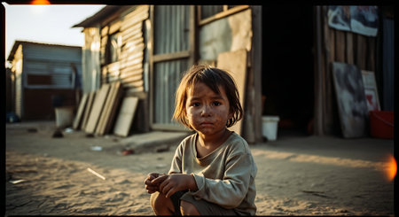 Beggar child. Concept of hunger and injustice in the world. Slums and a hungry dirty child.