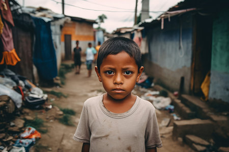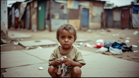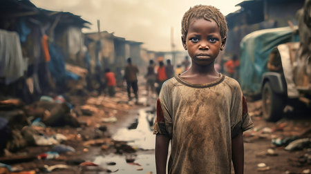Little boy standing in poor neighborhood. Sad child living in poverty on messy district. Generate ai