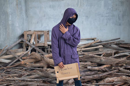 Homeless beggar boy winter people cold person. poor lonely