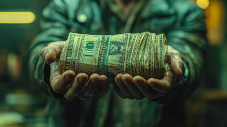 Hands holding a thick bundle of dollar bills, representing wealth, finance, and monetary success.