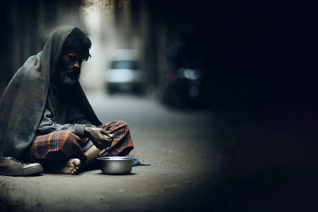 A beggar sits on the road begging for alms