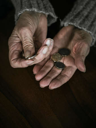 hands of an old woman with pennies on the table, money in the hands of a pensioner