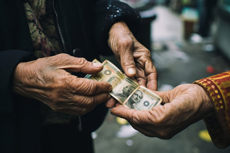 the guy gives coins to the beggar, cash assistance to the poor.