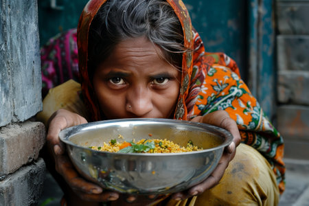 A starving person is holding a bowl of food. She looks hungry and is about to eat
