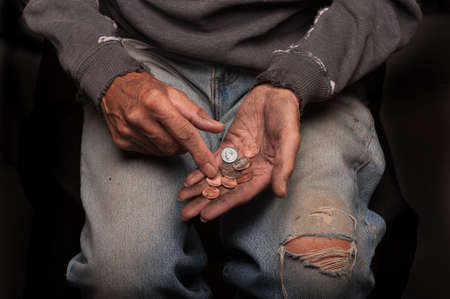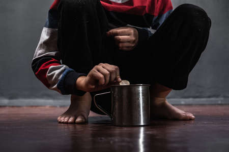 Homeless man is sitting down on walkway in town. He is receive dollar.He is hoping to have the better life. poverty, despair, Photo Sympathetic and hope concept.