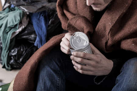 Due to the pandemic the homeless man lives by the walkway and begs for donation. He suffers from hunger, holds out his hand and mug.