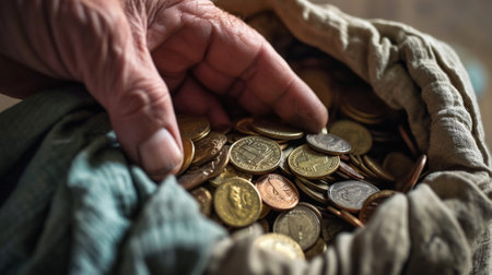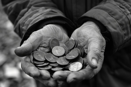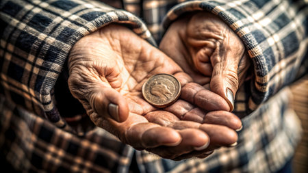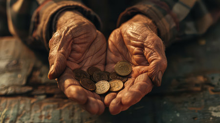 Monochromatic image of aged hands holding coins, representing poverty or economy concept AI