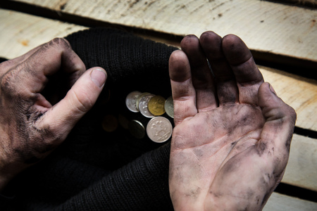 The beggar considers coins. A beggar on the street is holding dirty hands with money