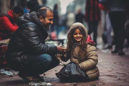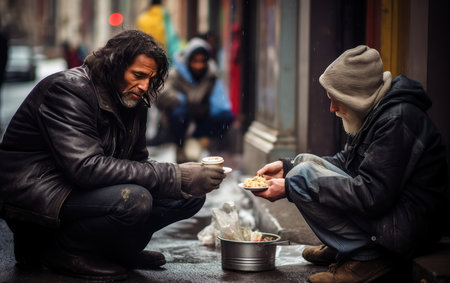 Homeless Man Holding Out a Bowl of Food, Seeking Assistance from Compassionate Bystanders