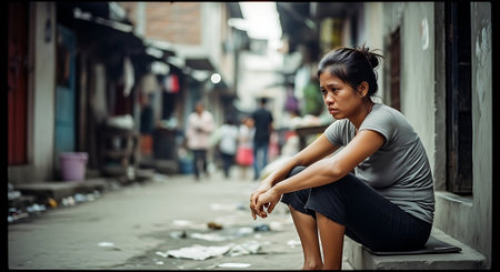 Elderly woman extends her hand while begging in the streets of a slum, highlighting the stark realities of poverty and the need for social support